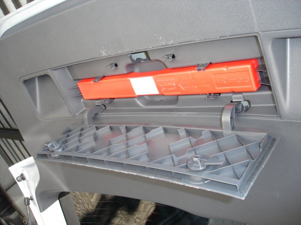 工房長です。トゥーランのトランクリッド裏側には、開閉可能な蓋があり、その中にワーニングトライアングルを納める仕掛けが備わっています。今回、ワーニングトライアングルの取り付け評価を行ないましたところ、実にピッタリと納まることが確認できました。純正なので当然ですね(^_^)。