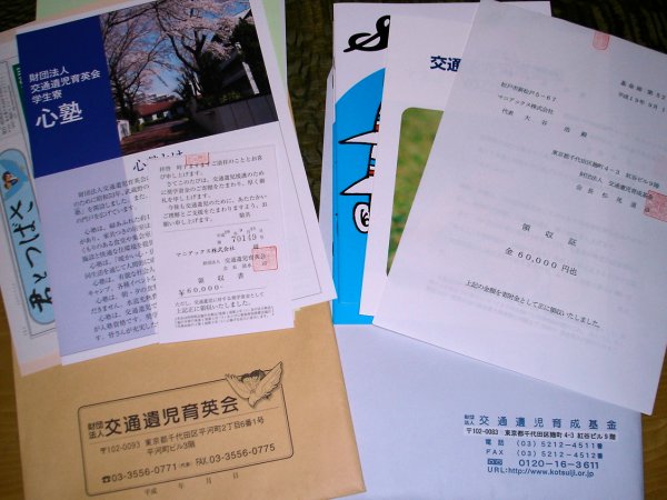 店長&工房長です。寄付金は、おもに皆様からチャリティのかたちでお預かりしたものです。私たちは、皆様の代理として皆様のお気持ちと共にお届けして参りました。皆様からのチャリティ64,280円にmaniacsから55,720円を加え、合計120,000円を、交通遺児育成基金と交通遺児育英会に半額(60,000円)ずつ寄付いたしました。皆様のご支援本当にありがとうございました。