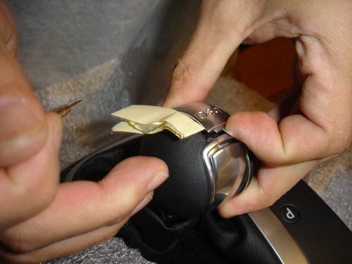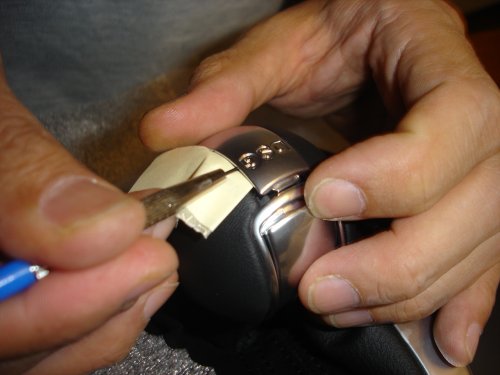 まず、シフトノブの上部にある、DSGと書かれたメッキカバーを外します。メッキカバーとノブ本体の隙間に、細いマイナスドライバーを差し込みます。革の部分やメッキ部分に傷をつけないように、紙などで養生します。紙を先に隙間に差し込んでおくと良いと思います。