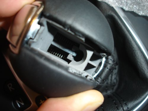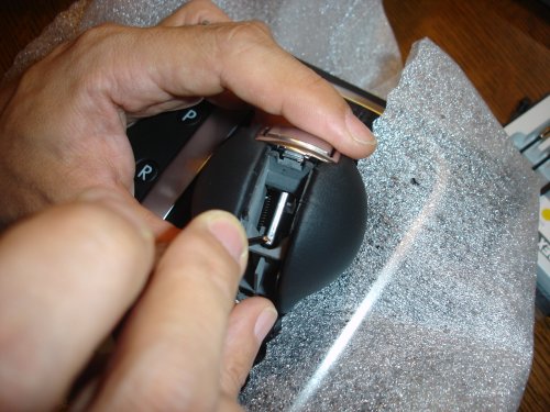 これで、ノブは元に戻りましたので、車輌への取り付けはこのノブをシフトレバーのシャフトに挿すだけでOKです。念のため、ノブ上部のメッキカバーは閉めないままにしておき、車輌に装着完了してから、最後に閉めてください。あぁ、肝心のシフトノブの取り外し/取り付け方法を説明していませんね。取り外し取り付けは、ずっと簡単です。それは、また今度(爆)。