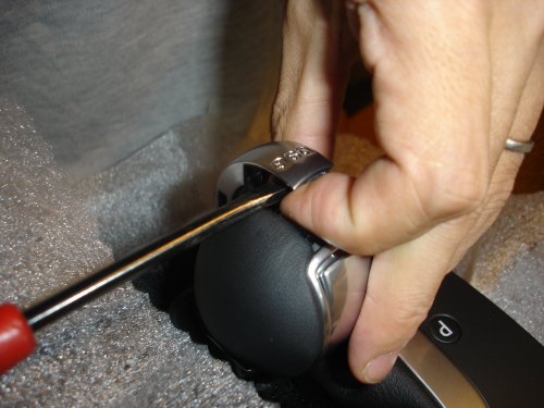 細いドライバーは無理に押し込まずに、慎重に作業してください。細いドライバーを差し込んだら、それをこじって、メッキカバーを少し浮かせます。浮いたら、左手の指でその状態を保持します。