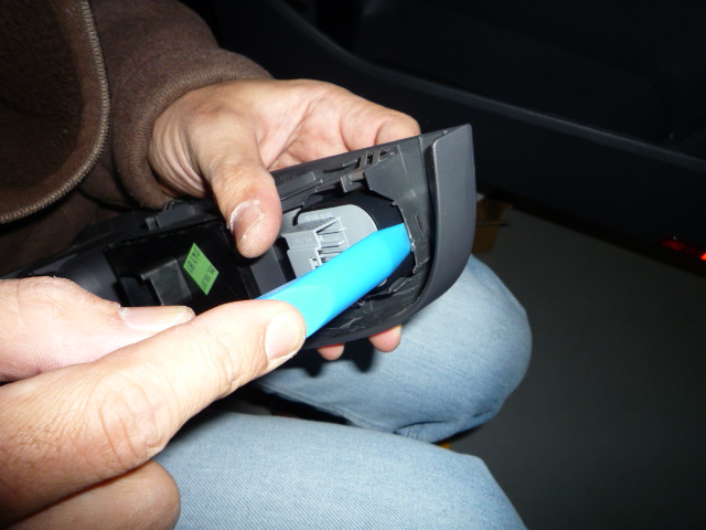 次に、ミラースイッチを外します。これは3箇所の爪で固定されています。車両前方側の一箇所の爪を解放することで安全に取り外せます。爪の位置を確認して、カバーとの隙間に内装はがしを少しずつ入れ爪を解放します。解放出来たことが目視確認出来ると思います。その状態で裏側から押します。