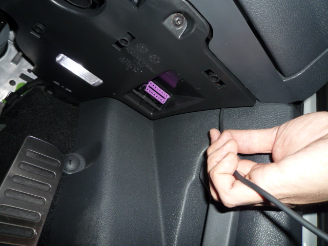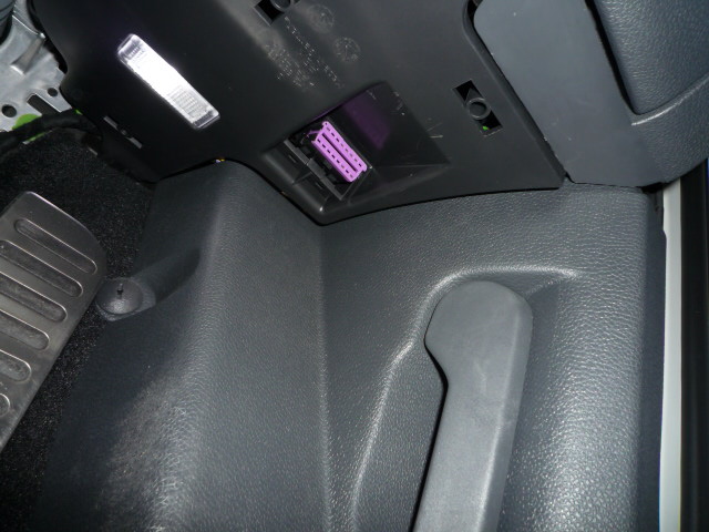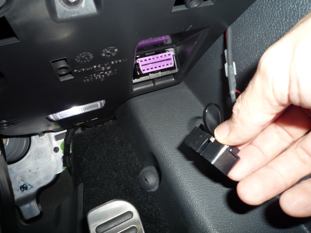 次にOBD2ポートにコネクタを差し込みます。OBD2は天面にある薄紫色のコネクターのことです。ケーブルの余長は全部上にたぐってください。コネクタは向きを合わせて差し込むだけです。