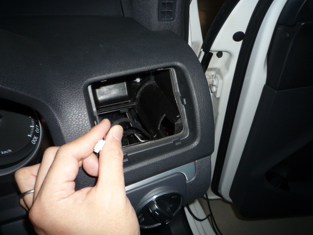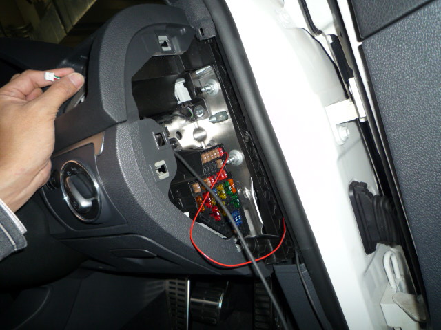 上部は、配線ケーブルの先端のコネクターを、エアコンルーバーの空間に導きます。ヒューズボックスの上部とエアコンルーバーを外したスペースはつながっているので、簡単にケーブルを通すことができます。