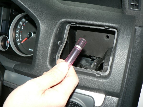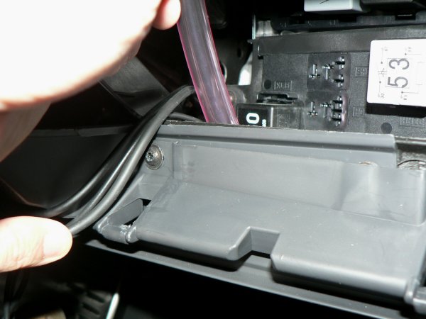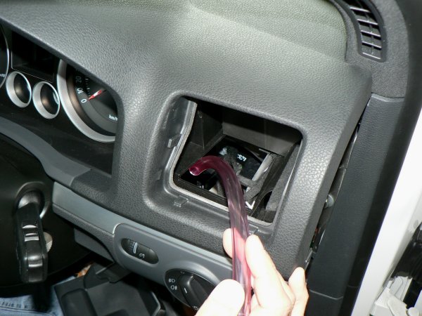 小物入れを外したら、掃気ホースをエアコンルーバーの穴から下方向に差し込んでいきます。ホースの片方の先端付近にマーキングがありますので、マーキングしてない方を先頭にして差し込みます。ホースはやや左寄りに差し込むようにするとスムーズです。