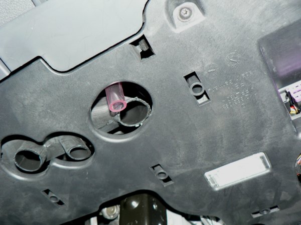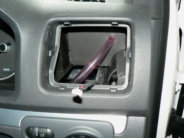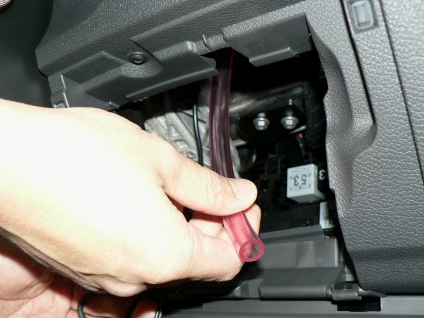 ホースは、写真のようにエアコンダクト用の穴の隙間スペースから顔を出させます。写真の右端はODB2ポート、右下は足下灯です。ペダル付近のスペースの天井部分を写したものです。ホースは抜け落ちないように、付属のタイラップにて適宜固定してください。緩めの固定で大丈夫です。