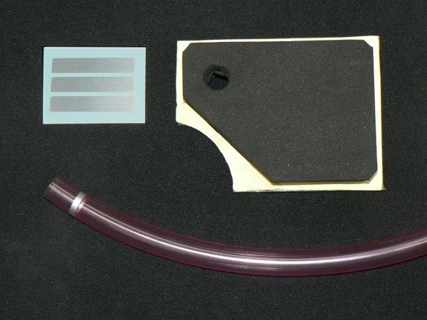 さて、いよいよby_maniacsコンプリートの説明です。by_maniacsコンプリートには、Pivotマルチゲージ本体と、OSIRメーターポッドの他に、左写真の3点がセットになっています。右上がエアコンダクトのリッド、左上がメーターポッド用のフィッティングシート、下はエアコンダクトからの気流を逃がす掃気用ホースです。