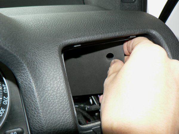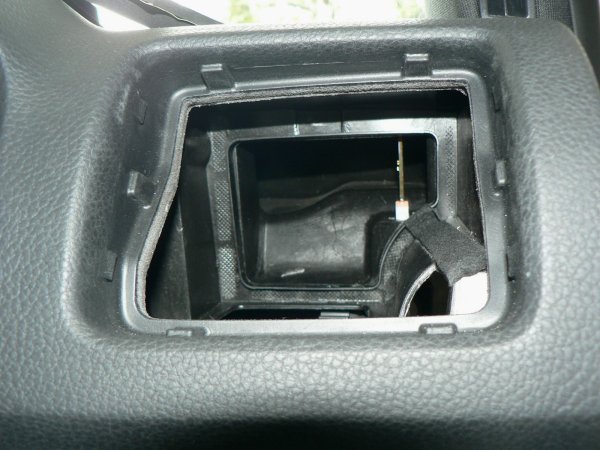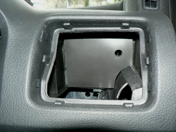 エアコンダクトを取り外した内側は、写真のように車輌側のダクトが開きっぱなしになっています。このままPivotマルチゲージXVを装着してもほとんどの場合大きな問題はないと思いますが、エアコンの空気がPivotマルチゲージXVに直接あたるので結露等がやや心配なのと、ダッシュボード内部に回り込むのも今ひとつ釈然としません。