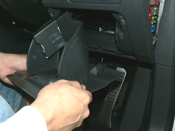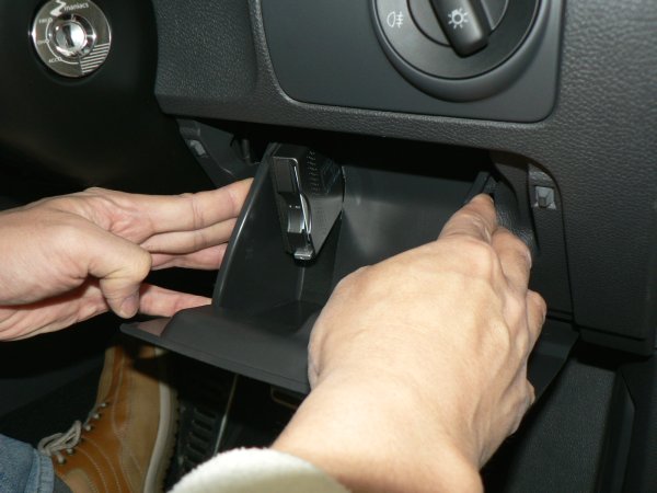 大きく開いたら、小物入れの前面が水平になるくらいの角度にして、手前方向に真っ直ぐ引きます。写真のようにヒンジはC型になっているので、手前に引っ張ると外れます。ヒンジが外れると、小物入れ全体が取り外せます。