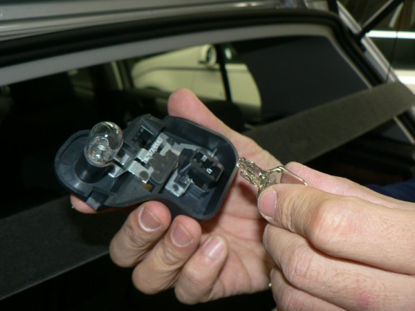 取り外したソケットから、バックランプのウェッジ球を抜きます。写真の位置の球です。後退直後は電球が熱くなっていますので、火傷しないように冷めるのを待って作業してください。