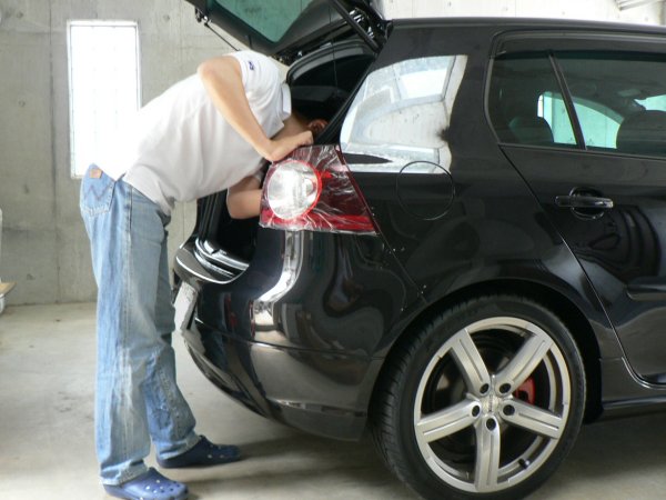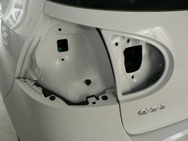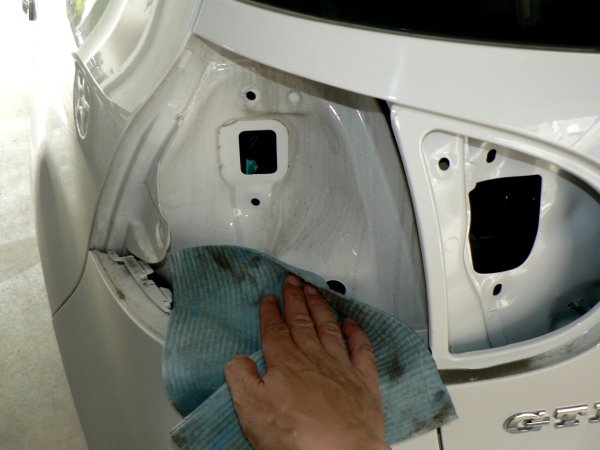 こちらは、白のGTIにLEDテールの装着です。ボディカラーが白でしたので、装着時のクリーニングの様子を撮影してみました。テールランプを外した内側のボディは、新し目の車でもかなり汚れが溜まっています。この写真の状態(クリックして拡大画像でご覧下さい)でもかなり綺麗な方で、もっと真っ黒な汚れがゴッテリ付着していることも少なくありません。maniacsでは丁寧にクリーニングして、できる限り綺麗な状態にしてLEDテールを装着しています。クリーニングを行うことで、パッキンがしっかり密着して、浸水等のトラブルを未然に防げます。LEDテールを装着してしまえば見えなくなってしまう部分ですが、内側も綺麗になっていると思うと、何となく気持ちがよいですね。