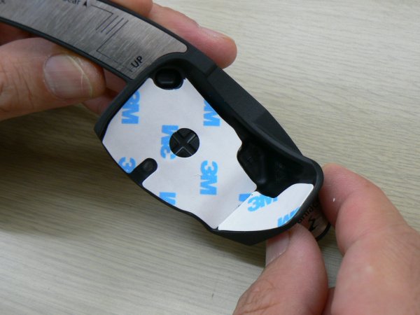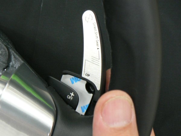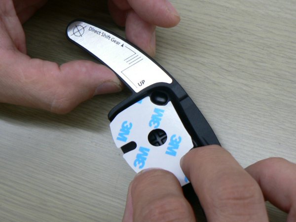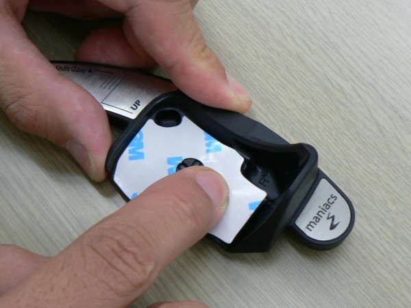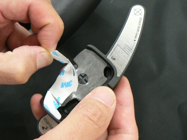 両面テープをmaniacs DSG Paddle Extensionに貼ったら、一旦剥離紙を剥がさないままでパドルシフトに宛ってください。フィッティングを確認するとともに、両面テープをmaniacs DSG Paddle Extensionに確実に密着させます。