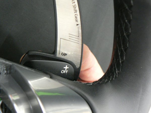 なお、写真は撮影の都合により、ステアリング単体ですが、実際には車輌のステアリングに直接両面テープで装着できます。走行前に、ステアリングをいつも通りに握ってみて、パドルシフトを操作してみて、異常がないことを確認してください。