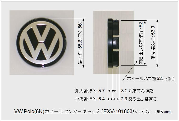 工房長です。お問い合わせの多い、ホイールセンターキャップの寸法を写真と寸法図でまとめてみました。VW純正ホイール(ハブ径56mm、52mm)には、下記のいずれかが適合します。純正以外のホイールにつきましては、下記の寸法をご確認の上適合をご判断ください。