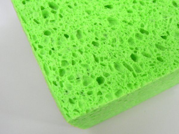 そこで、シュアラスターに代わるスポンジを市販品の中からかなり一生懸命に探したのですが、残念ながら満足のいくものが見つかりませんでした。maniacsとしては妥協して中途半端なものを販売したくないので、いろいろ検討した結果、東レ・ファインケミカルに別注することにしました。スポンジと名の付くものは世の中に種々あります。ウレタンスポンジ、ポリオレフィンスポンジ、PVAスポンジ、etc.。PVAスポンジンなどは比較的洗車にも適しますが、maniacsでは洗車用のスポンジは天然セルローススポンジに限るというのが、いろいろと試してきた私達なりの結論です。