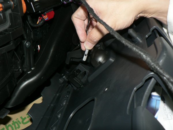 最後に、助手席エアバッグスイッチ用のコネクタを抜きます。水色のロックを引っ張った状態でコネクタを引っ張ると抜けます。このコネクタを抜いた状態でイグニッションをONにすると、エアバッグ警告灯が点灯してしまい、再度コネクタを接続しても警告灯が保持されてしまいます。このコネクタを外した状態ではイグニッションをONしないようにご注意ください。