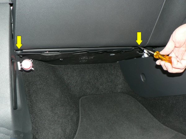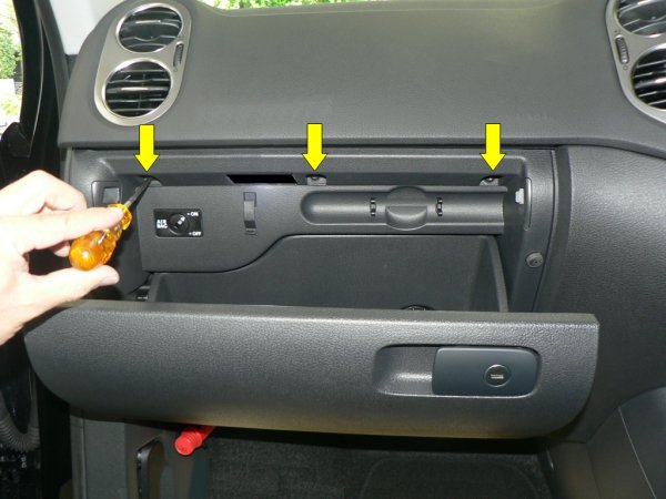 つぎに、ダッシュボード左端のカバーを開きます。写真ではグローブボックスにマニュアル類を入れたままにしていますが、実際の作業時にはこの時点で内容物を全て取り出して空にしておいた方が後の作業が楽です。左カバーを開いたら、正面から上3箇所、下2箇所のネジ(写真の矢印の位置)を外します。ネジはトルクスT20です。