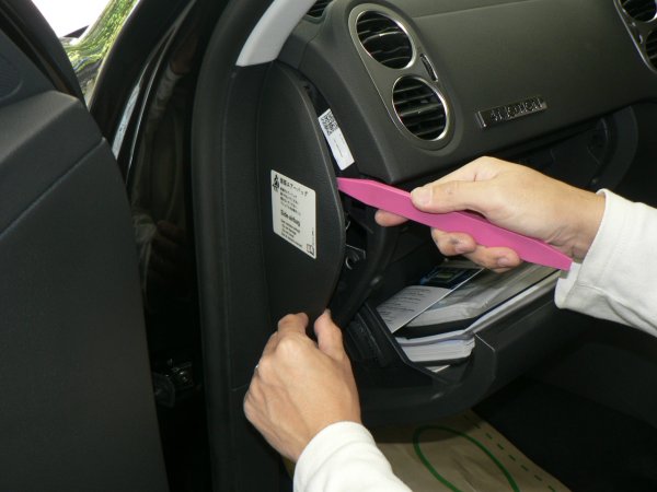 工房長です。RNS510 VICS BEACON RECEIVER by maniacs(MVR510S)を装着する際、Tiguanの場合はグローブボックスを脱着する必要があります(他の車種でビーコンレシーバーを装着するにはグローブボックスの脱着は基本的に必要ありません)。VWの車輌ではグローブボックスが簡単には脱着できない車種も多いのですが、Tiguanの場合は他のカバー類やコンソールを外すことなくグローブボックスだけを脱着できるので、とても簡単です。