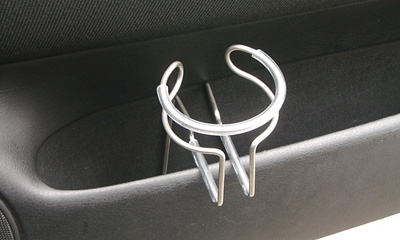 このホルダーはポケットより手前かつ少し上に位置するので、邪魔じゃないかと心配したのですが、実際に装着したらそれは杞憂でした。運転中は手にも足にも全く邪魔にならず、乗り降りにも邪魔になりません。そして、それ以上に良いことは、ドリンクが丁度良い位置に来て実に取りやすいのです。ドライバーが右手を自然に伸ばした位置にドリンクがあり、身体を動かす必要がありません。