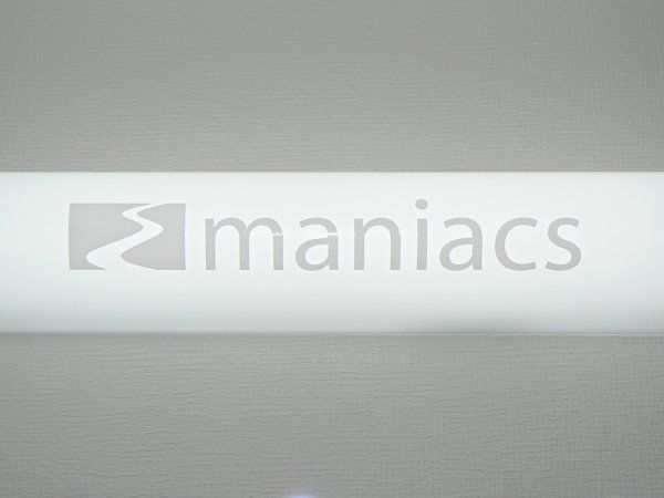 工房長です。maniacsステッカーのもっと大判のものはありませんか?といろいろなお客さまからご要望いただいておりました。今回、思い切ってかなり大ぶりのステッカーを作ってみました。製品ができ上がってきましたので、さっそく貼り付け評価を行います。ガラス面への貼り付け評価は、実用を兼ねてmaniacs本社事務所の入り口ドアに貼ってみました。思った以上に良い感じです。