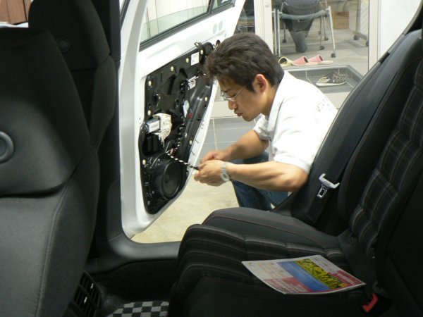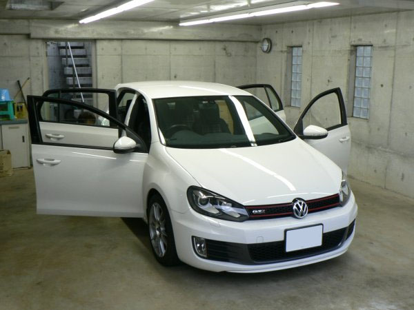 次のお客様は、ホワイトのGolf6 GTI (MY2010)で、VW純正 カーテシランプ by maniacs【ご来社装着専用】(種類:フロント・リア/ドア4枚(ノーマルバルブ仕様))を装着しました。カーテシランプを装着する際には、ドアパネルを一旦全て外します。新車のドアパネルは工場の組立ラインで装着されていますが、ネジ締めなどは電動工具で締めますので、稀にネジ穴に対して斜めに無理締めされているケースがあります。maniacsでは脱着の際に、そうした組立状態も確認し、場合によっては雌ねじタップの修正も行って、正常にネジ締めして再組み立てを行います。