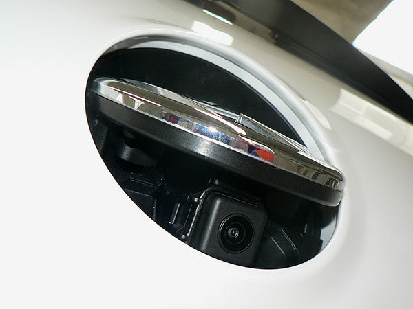VW純正バックカメラは、ほとんどの社外製カーナビゲーションに装着できます。ギアをバックに入れると、ハッチのVWマークの部分が開いて、カメラが現れます。この機構により、カメラを使用しないときには完全に隠しておくことができますので、スッキリと納まるだけでなく、レンズ部分が無用に汚れるのを防ぐことができます。また、カメラの位置が左右のセンターで、高めの位置にあるため、画面を通して歪みの少ない自然な後方視界が得られます。今回、 Sprung Colored Plateを同時装着して、艶やかな高級感を演出しています。