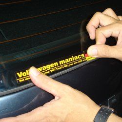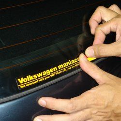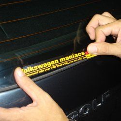 maniacs edition 独色ステッカーは、横長のデザインのため、例えばリアガラス下部の黒味部分に貼る場合など、ガラスの縁の僅かな湾曲とステッカーの直線が微妙な違和感になってしまう場合があります。