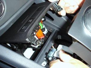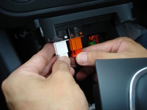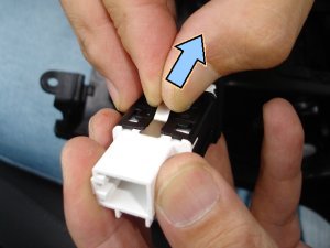 それからシガーライター用のコネクタが右奥にありますので、それもロックを握って解除して引き抜きます。こちらのロックは手指でしっかり握れば解除できます。最後に、車両の年式や個体によってケーブルクランプがアシュトレイの裏側にスナップフックで固定されている場合があります。その場合はスナップフックを大きめのマイナスドライバー等でこじるようにして外します。コツを掴めば簡単に外れますが、難しい場合は包縛をニッパーでカットしてしまっても構いません。