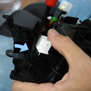 アッシュトレイのアッセンブリーを丸ごと外したら、そこから赤と白のソケットが付いたスイッチを外します。要領を掴めば難しくないのですが、意外と手こずる場合もあるようでご質問の多い箇所でしたので、少し丁寧に説明します。