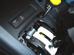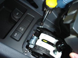 取り付け作業は、サイドブレーキをしっかり掛け、一旦エンジンを始動しブレーキを踏んでシフトをDまたはSレンジに入れ、その状態でイグニッショんをオフにしてエンジンを停止します。シフトノブが上左写真の位置に来ます。
