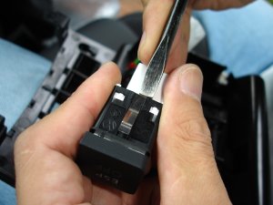 次に、ソケットをやや傾けて下に軽く押した力をキープしたまま、今度は逆側の板バネをマイナスドライバーの先端で押してすぼめます。これで、板バネのロックが外れてソケットが下に押しぬける感触があるはずです。