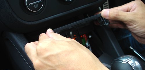 取り付けが完成したノンスモーカートレイです。トレイの底には、ラバー製のマットが付属しており、小物を置いたときのカタカタ音や傷つきを防いでくれます。気軽にアクセスできるトレイは、実際に使ってみて、とっても便利です。ノンスモーカーや、車では吸わないという方には、間違いなくお奨めできるモディファイメニューです。VW ノンスモーカートレイ(Golf5/Jetta)