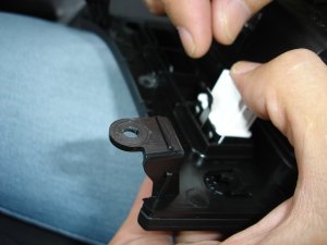 あとは、アッシュトレイを外したのと逆の要領で、ノンスモーカートレイを先端から斜め方向に差込みます。このとき、車輌の個体差によって差し込み難い場合があります。理由は、ノンスモーカートレイの方がアッシュトレイよりも、先端の厚みが若干厚いためです。これはパーツの製造公差によるものです。差し込み難い場合は、一旦アッシュトレイで先端を差し込む感触を練習してみてください。