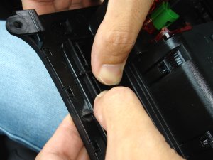 あとは、ブランクカバーも外します。ブランクカバーは裏から押せば外れます。外したスイッチとブランクカバーは、ノンスモーカートレイの方に移設します。スイッチ類を運転席側に入れ替えたいところですが、スイッチの穴にバカよけのキーイング(穴の形状がそれぞれ違えてある)があり、そのままでは運転席側に入れ替えることはできません。入れ替えたい場合は、キーイングのリブをニッパー等でカットすれば任意のマス目に挿し込むことができます。スイッチおよびブランクカバーを嵌める際は、表側から差し込んで、押せばパチンと嵌ります。