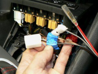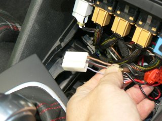 まず、シガーライターの白いコネクタのロックレバーを押さえながら下方向に引っ張って外します。外した白いコネクタへの配線は、黒い布テープが巻かれていますので、布テープを先の細いハサミなどで切って少し解き、コネクタから4cm程度まで配線が見える状態にします(左写真)。布テープを解くためにハサミを使う際、配線を傷つけないように注意してください。配線は茶色と黒赤色の太い線と、灰色ーの細い線の、3本です。この3本にそれぞれオルタネート変換モジュールの配線を接続します。