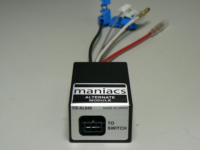 オルタネート変換モジュールとmaniacs Console Decorative Switchは、写真のように6ピンの黒いコネクタをモジュールに差し込むだけです。以上で接続は完了ですので、とても簡単です。すでにスイッチを装着済みの場合は、車輌配線に接続したハーネスをオルタネート変換モジュールに置き換えて、スイッチのコネクタをオルタネートモジュールに接続することで、オルタネート動作になります。