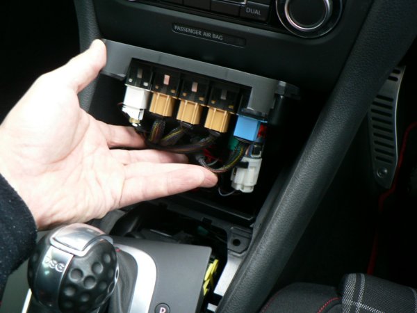 シフトゲート部分を外して、ネジ2箇所を外して、アシュトレイの手前を持ち上げると左写真のようになります。写真はすでにmaniacs Console Decorative Switchが4つ装着されている状態です。写真の右側、少し奥に見えるのがシガーライターソケットのコネクタです。オルタネート変換モジュールの配線はこのコネクタの配線に接続します。