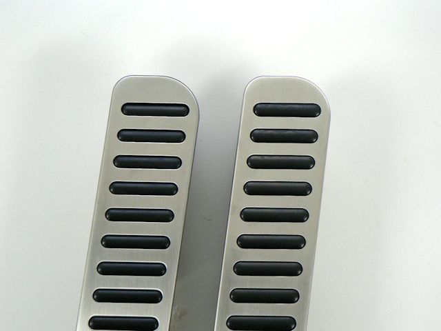 写真は、左がTゼロ品、真ん中が今回のT1品、右は純正のGTIペダルです。ラダー状のゴム部品の太さを調整した効果が分かると思います。ラダー状の突起は立体的にラウンドした形状で、T1品の写真はこの丸み艶やかに見えています。この表面状態は、これから金型にブラスト処理を加えて梨地にします。ステンレスプレートもヘアラインの表面状態を今回微調整しました。T1からT2に向けて、さらに各部の最後の詰めを行って、完成度を高めています。発売までもう少しだけお待ちください。