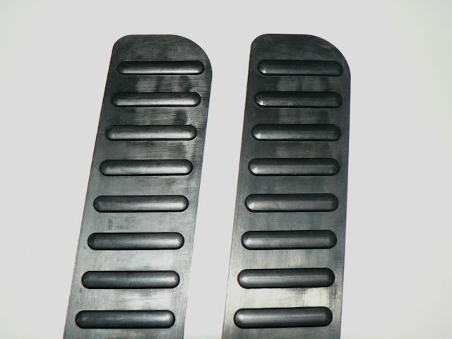 工房長です。GTIタイプアクセルペダル(仮称)のTゼロ品を評価して設計にフィードバックし、金型修正やNCプログラム修正を行い、それらを反映したT1品のアンプルができ上がってきました。今回のTゼロ→T1の調整でどこが一番変わったのか?一番変わったのはペダル踏面のラダー状にゴム部品が突起した部分のデザインです。写真の左が調整前で、右が調整後、間違え探しのようですね(笑)。実はゴム部品の突起一つ一つの幅(写真の縦寸法)を0.6mm太くしています。