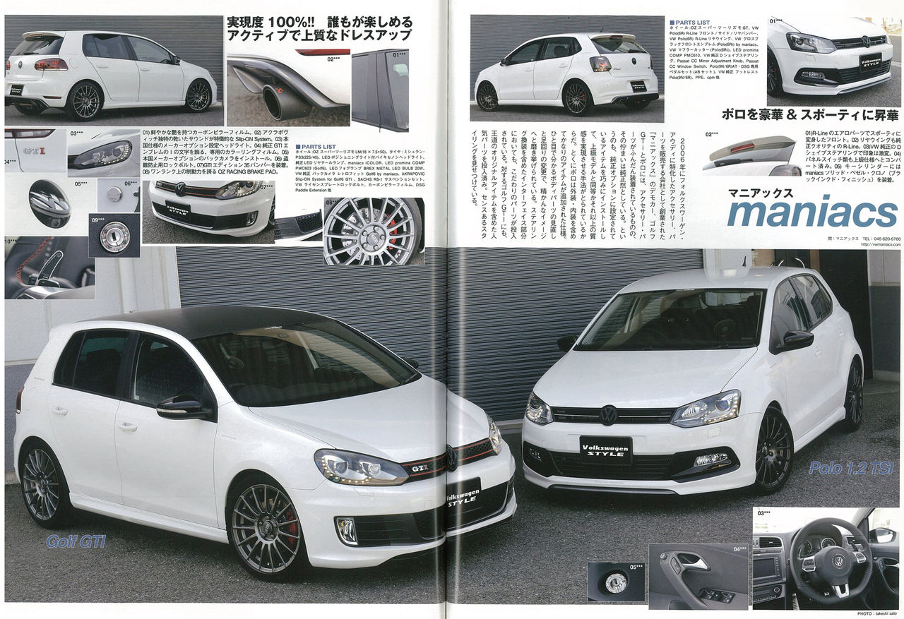 上記の画像は、2013年5月31日に発売された、「VW+STYLE」(amazon.co.jpにリンクします)に取材していただいた内容です。ごらんの通り、いわゆる「デモカー」としては地味ですねー(笑)。なぜ、地味なのか?それはmaniacsの創業者である2名が、元々は普通のVW/Audiオーナーだからです。VW/Audiは元々、すばらしいクルマですが、やはりそれはあくまで既製品です。自分にとって、もう少し、こうだったら...と思うことはありますよね? しかし、元々のクルマの素性が好きなので、元々のデザイン、機能性は尊重しつつ、自分向けにカスタマイズしたい。なので、カスタマイズの方向性が、普段使えて、家族で使えて、派手すぎない、となると、ショップのデモカーにしては地味になってしまいます。