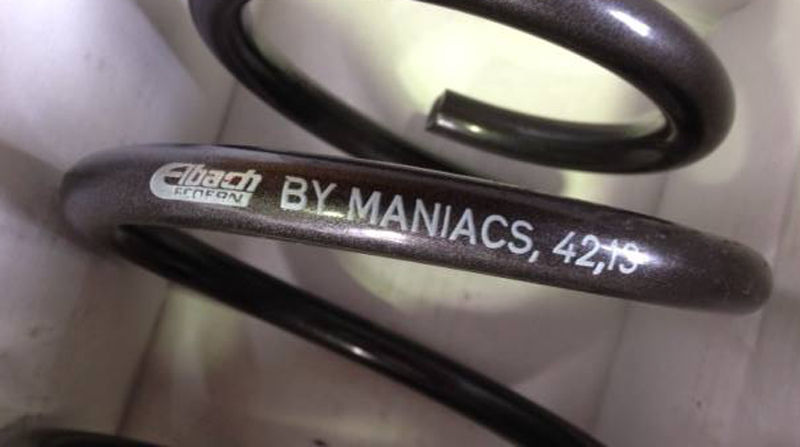 そこで、私たちは、H&R社とeibach pro kitをテスト。お好みもあるので、一概に善し悪しは言えませんが、気になったのは、どちらも、やや車高が下がりすぎる傾向にあるのと、前後の車高の下がり方のバランスが、新車状態と同じで前下がりであるという点。もちろん、「下げたい」方は既存品で十分ですが、「少しだけ下げたい」というご要望も少なくありません。そこでmaniacsでは、思い切って独自スペックのスプリングを開発することにしました。