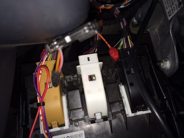 アンダーカバーのある車両でGolf6系のECUの場合は、アンダーカバーを外すとフットランプとOBD2ポートのコネクタも一緒に外れますので左の写真のように見えます。判断に迷う場合はその部分の写真をメールでお送りいただければ判別してお知らせします。クイックホーンモジュールの適合と、ホーン制御配線の接続先コネクタ番号とピン番号は
