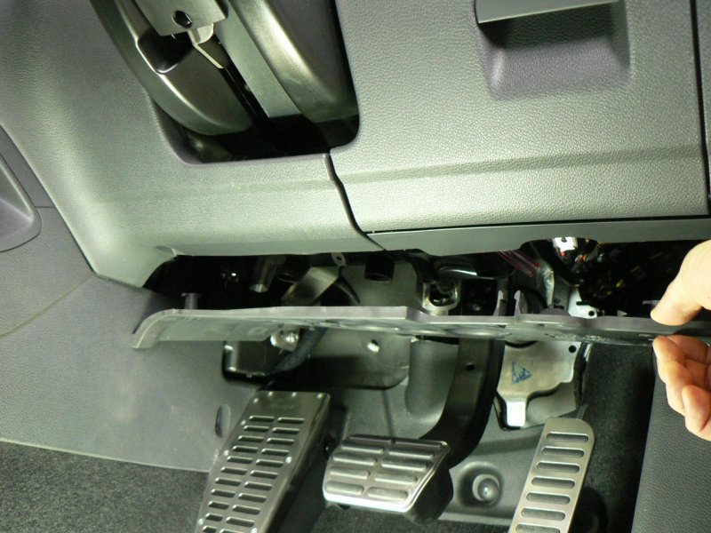 現車確認の方法を、上の写真で説明します。まず、ダッシュボードの下面、運転席足下の真上のところにアンダーカバーが装着されている場合は、トルクスT20のネジ3箇所を外してカバーを取り外します。アンダーカバーの有無はECUの形式と関係しませんので、アンダーカバーがある場合は外してその内部を確認する必要があります。アンダーカバーがある場合は外して(ない場合はそのまま)アクセルペダルの真上付近を見上げてください。仰向けで頭を入れて見上げるか、もしくはハンディライトと手鏡等でも見ることができます。