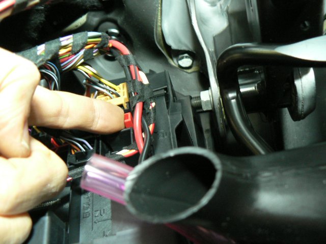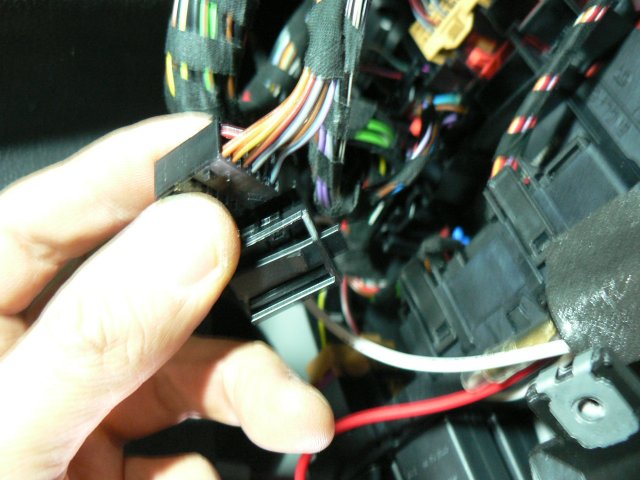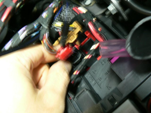 そのコネクタを抜きます。中写真のように赤色のスライド式ロックレバーがありますので、このロックレバーを、写真のように横にスライドさせて解除します。解除したら、コネクタ自身にあるロックを摘んで引っ張ると抜けます。車両個体によってスライド式ロックレバーの形状や色が異なる場合がありますが、先にそれを解除してから、コネクタ自身のロックを摘んで引き抜くのは同じです。