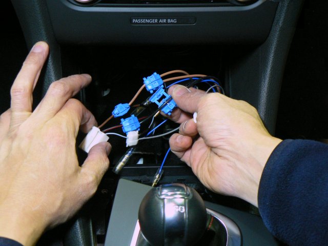 接続した青線(延長線)は、左方向に引き回して、適宜エアコンダクト等にタイラップで固定していってください(中写真の中央付近にあるタイラップと右方向に向かうメッシュチューブがそれです)。青線の先端は、センターコンソールの脇の隙間から、灰皿の下のスペースに引き込みます。ここも比較的広い隙間がありますので、配線の先端を難なく挿し入れることができます。