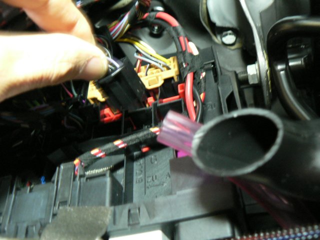 まずはモジュールの電源系配線の接続ですが、これはクイックホーンモジュールの装着方法(Golf5系、詳細版)と全く同じです。黒、茶、灰の配線を、配線色を合せてエレクトロタップで噛ませていきます。クイックホーンモジュールやオルタネート変換モジュールと一緒に装着する場合は、先に装着したモジュールの配線から上の写真のように分岐接続してください。