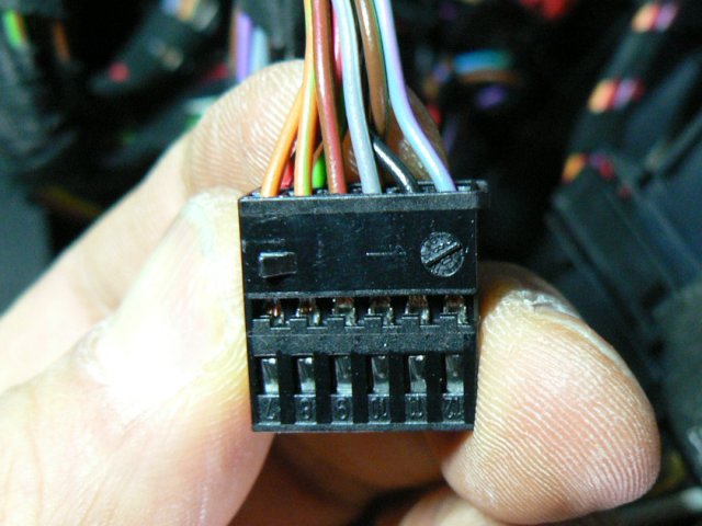 コネクタを抜いたら、コネクタのカバー状のハウジングを外します。ハウジングはロックの爪を細いマイナスドライバー等で解除しつつ横にスライドすると外せます。ハウジングを外すと、写真のようにコネクタにピン番号が刻印されていますので、9番のピンから出ている赤茶の線に結線します。布テープの包縛を少し解いて、配線をほぐして、9番ピンの赤茶線に、商品に添付の青延長線を赤色のエレクトロタップで噛ませて接続します。