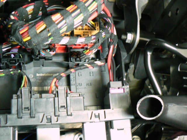 カバーを外したら、運転席足下の上部が見えるようになります。仰向けになってアクセルペダル付近まで頭を入れて、ハンディライトなどで明るくして、しっかり確認してください。左写真のようなレイアウトにコネクタが配置されていて、コネクタボックスにはアルファベットのコネクタ記号が刻印されています。左写真の中央付近にGの刻印が見えますが、そのすぐ上にあるコネクタGが目的のコネクタです(EOS、Sciroccoの場合のみコネクタNが目的のコネクタです)。