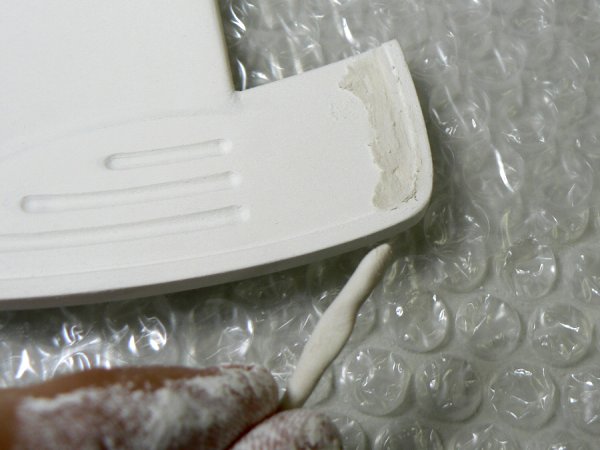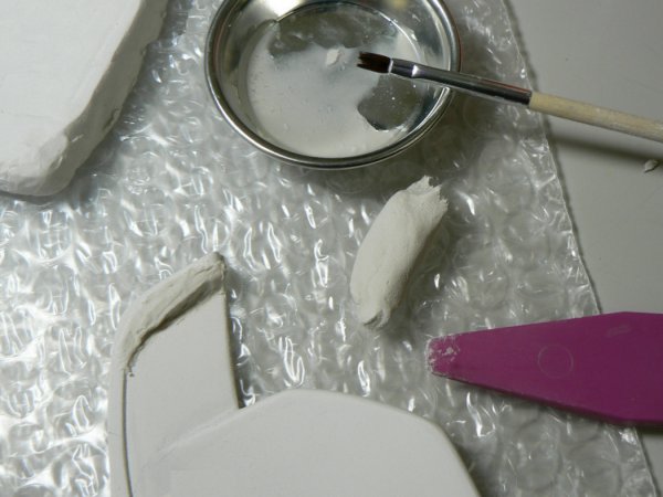 工房長です。見る人が見ると、この部分写真だけでも何かが分かってしまうのですが、紙粘土細工で何かを開発中です。盛り付けたり、削ったり、非常に精密にモデリングを行っています。材料はフィギュア用の粘土を使っています。ヤスリやナイフやリューターの刃先だけとかを使って、できる限り精密に仕上げていきます。