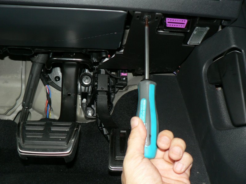 まず、シートポジションを一番後ろまで下げて、運転席のフロアマットを取り外してください。それから、ダッシュボード下面のカバーパネル(アクセルペダルの直上の天井部分)を取り外します。トルクスT20を1本外し、カバーを下、続いて手前に引っ張ると、この部分の小さなパネルだけ簡単に取り外せます。右写真のようにキックパネルの右奥にはケーブルの束が通っています。通常は気にする必要がありませんが、車両個体によって万一ケーブルが手前に張り出している場合や、後付けのレーダーやカーナビなどのケーブルが通してある場合は、これから装着するフットレストと触れないように奥方向に整理しておいてください。